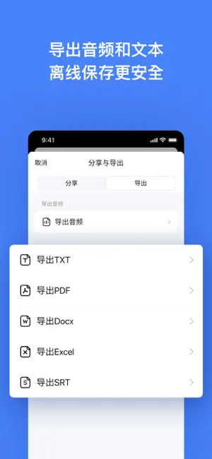 - 文档分享与导出:转写后的文本可以导出为TXT、PDF、DOCX等多种文件格式,并支持一键分享音频和文本。