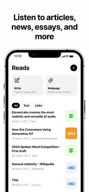 - 多种内容支持:应用支持多种文本输入方式,包括直接输入文本、粘贴网页链接、以及上传PDF和ePub文件。用户可以轻松地将网络上的文章、自己撰写的文档或下载的电子书转换为语音,享受听书的便利。