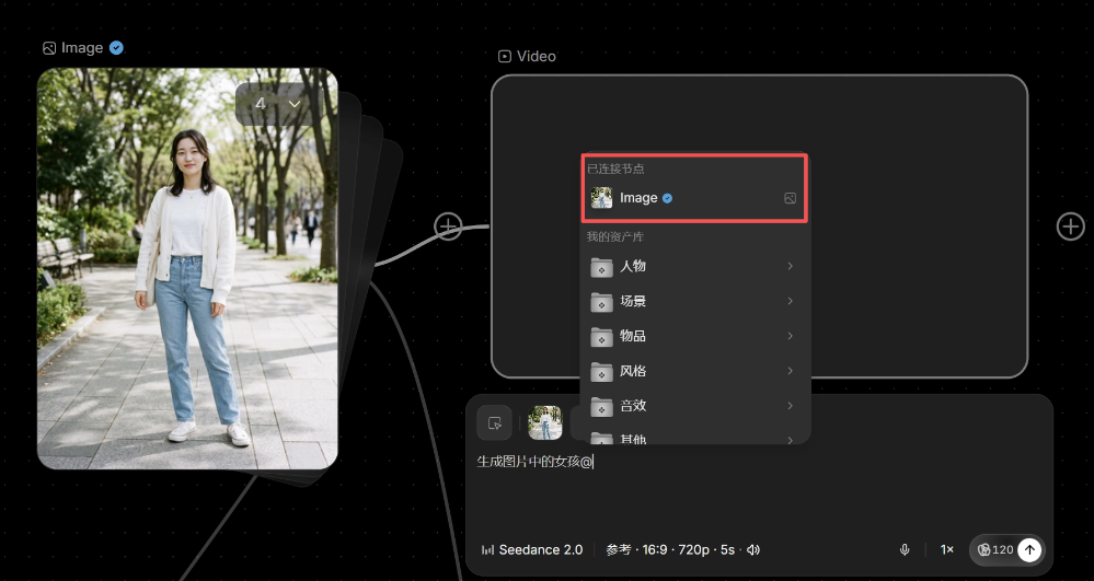 创建视频节点,并与图片节点相连,@图片 作为参考图加入到提示词中。