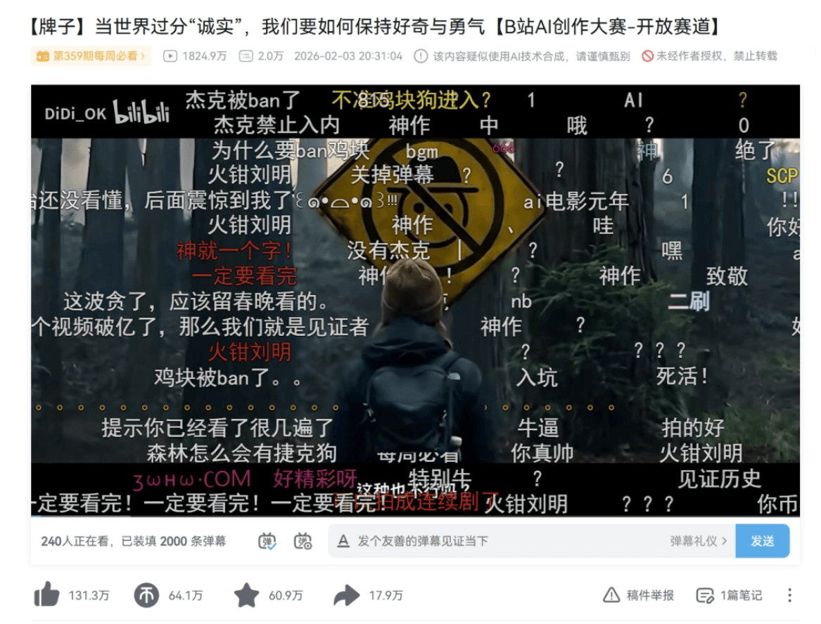 比如让人分不清现实和梦境的视觉神作《牌子》,全网播放量超 5000 万,一举斩获 B 站 AI 创作大赛冠军的百万大奖。甚至连《流浪地球》的郭帆,都在为他转发点赞。