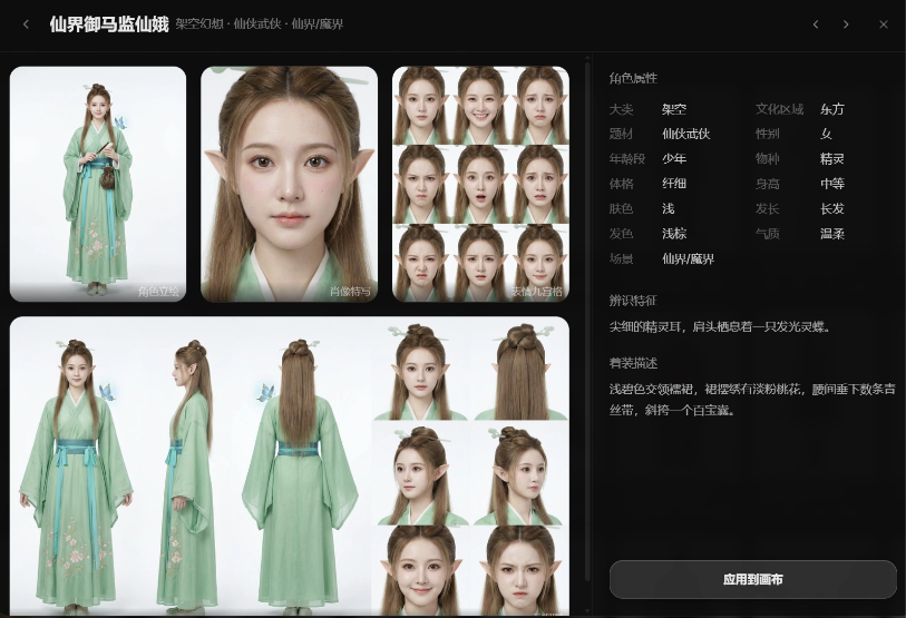 这些角色都支持一键应用到画布中。哪怕你完全 0 基础,也可以立即拥有这支庞大的演员队伍。