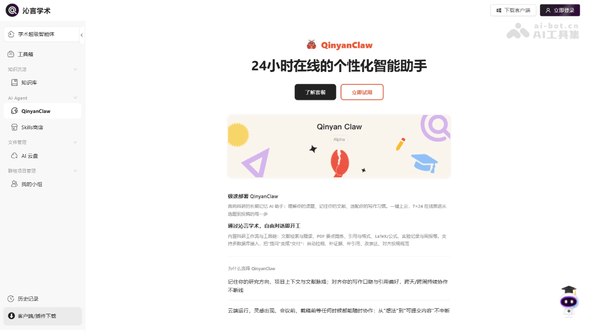- 注册登录:访问沁言学术官网 https://app.qinyanai.com/claw ,完成账号注册与登录。