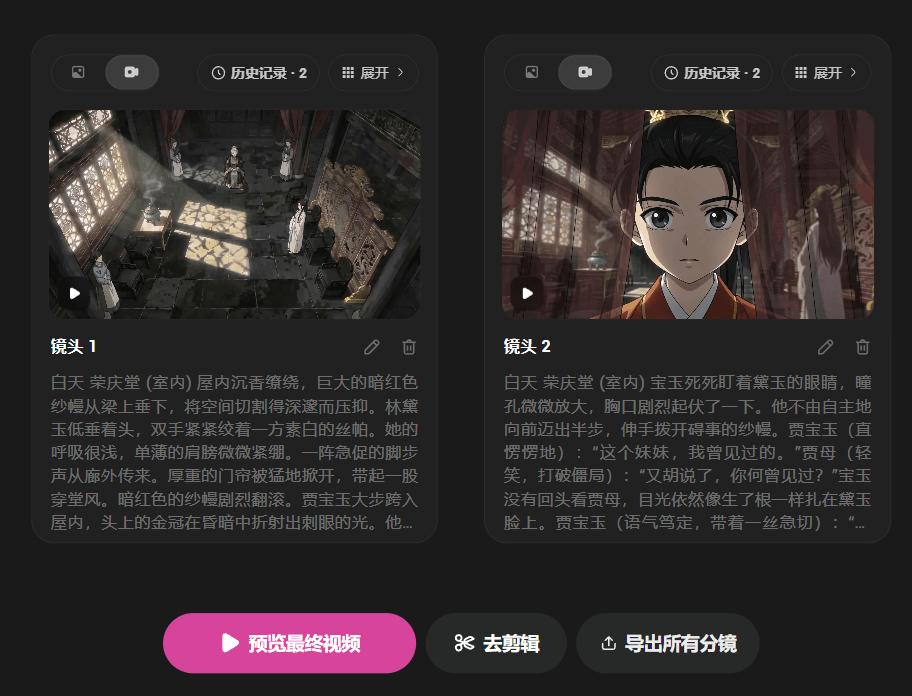 在这个过程中,我们可以实时预览每一个分镜,如果有不满意的,不需要全部重来,直接点击重新生成或者剪辑对单个分镜画面独立编辑即可。