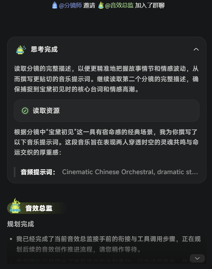 我们只需要给一句指令,剧本生成、角色设计、场景设计、分镜制作、音效生成、剪辑合成等等所有工作,这个 AI 视频创作团队都能会自动完成。