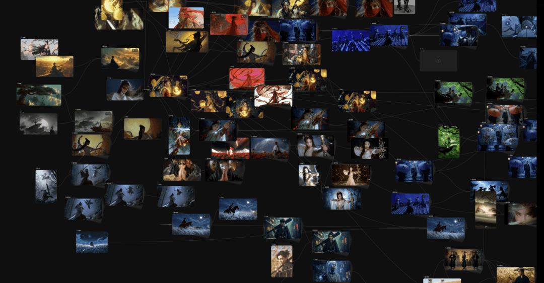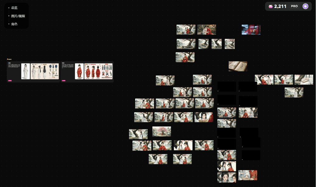 我们可以先让 AI 在画布上生成多角度的场景视图和精细的人物分镜,把所有的画面素材铺开对比。