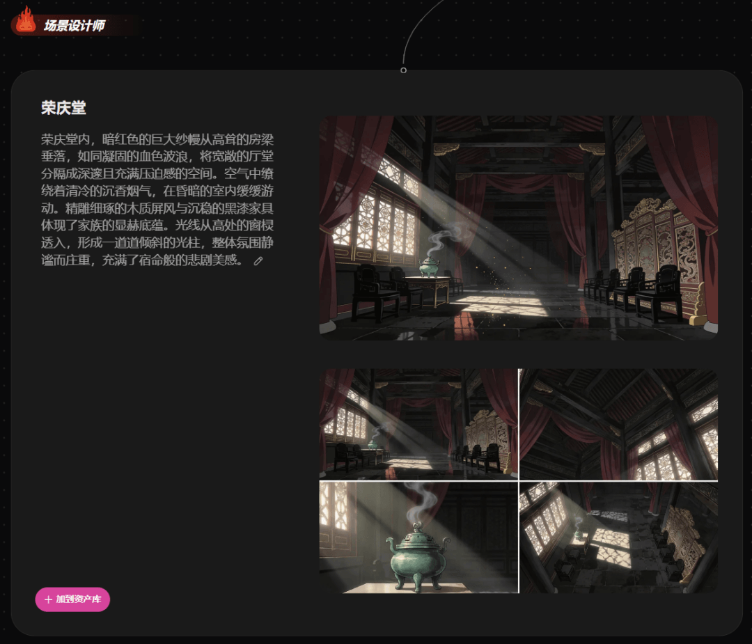 角色和场景都可以一键添加到资产库,随时都可以复用,做连续剧集非常方便。