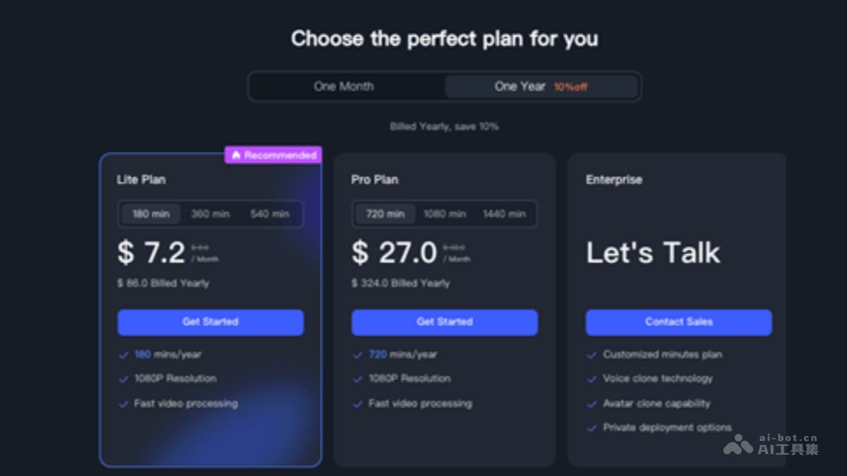 Lite Plan(推荐):每月7.2美元,每年支付为89美元,提供180分钟/年、360分钟/月、540分钟/月的额度,支持1080P分辨率和无限视频处理。