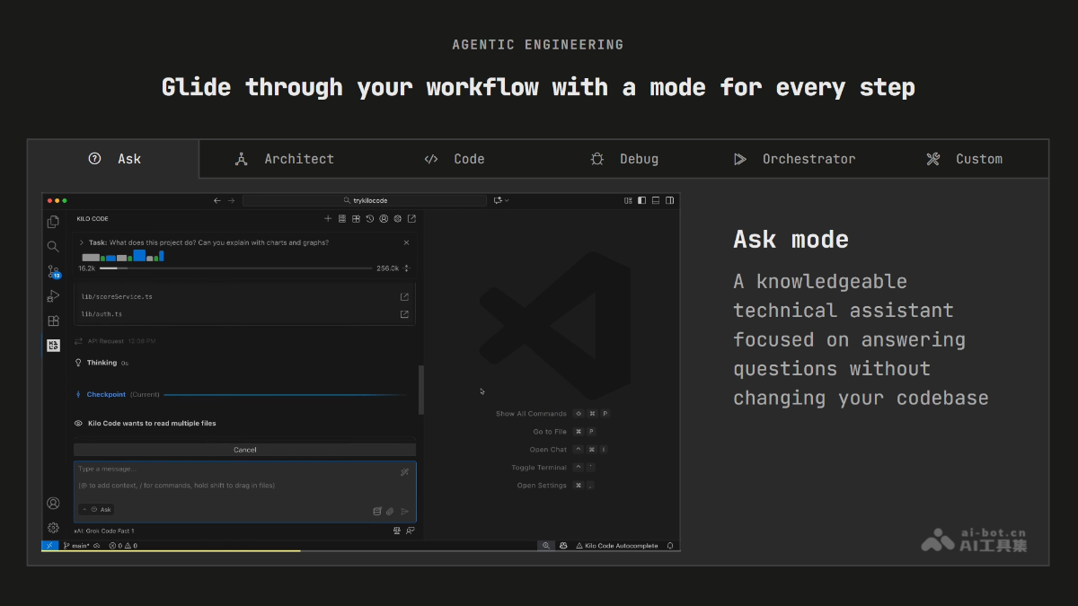 系统设计:架构师用 Kilo Code 的 Architect 模式快速规划系统架构,生成技术文档。