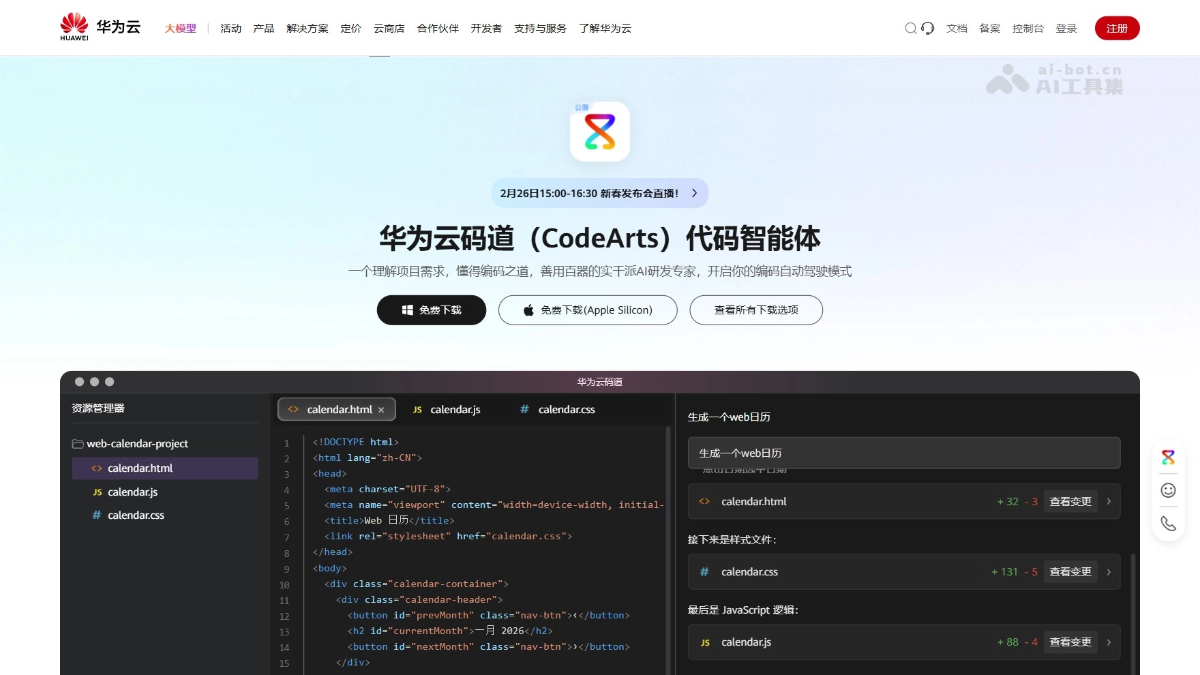 - 完成安装:访问华为云官网 https://www.huaweicloud.com/product/codearts/ai.html,选择对应系统版本(Windows x64或Mac Apple Silicon)进行下载安装,或在IDE插件市场搜索”CodeArts”完成安装。
