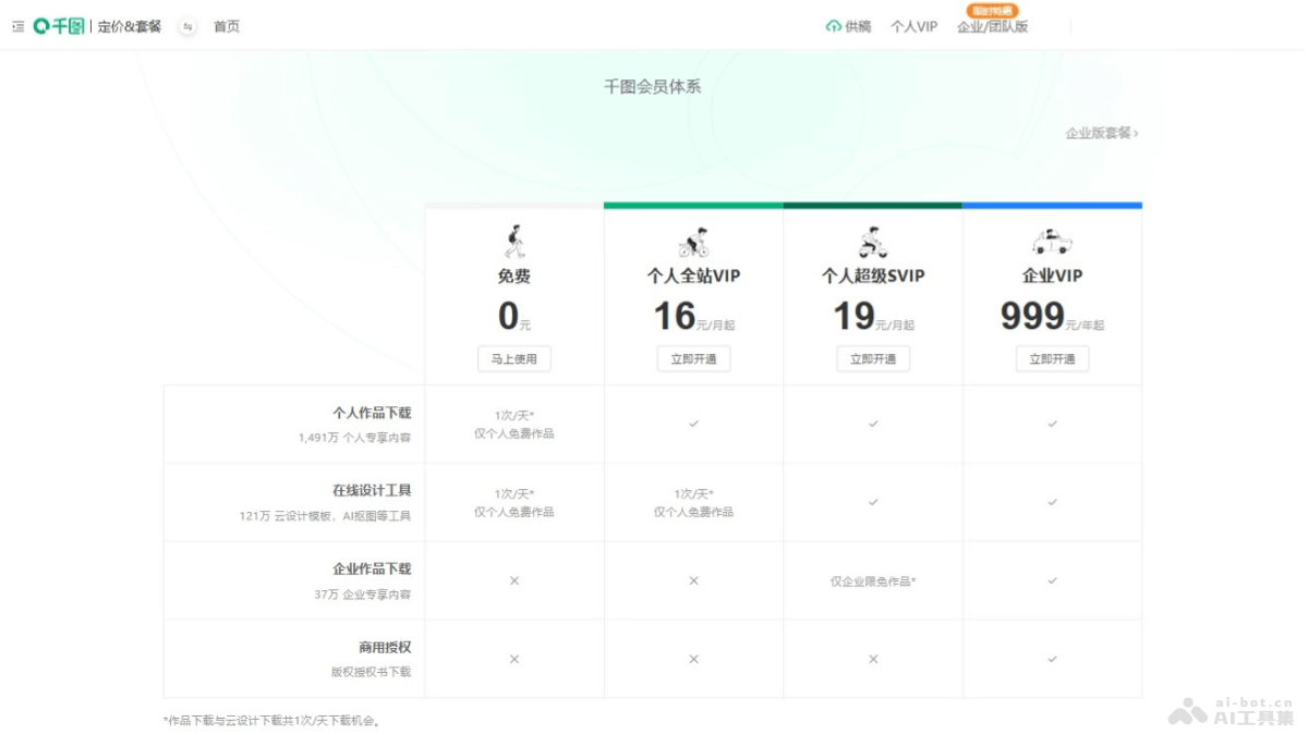 - 企业VIP:999元/年起。包括个人作品下载、企业作品下载(37万企业专享内容)、商用授权(版权授权书下载)。