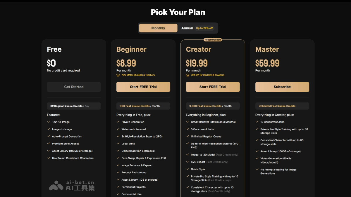 - 免费版:无需提供支付信息,完全免费使用,每天32个常规队列积分。功能包括:文本到图像、图像到图像、自动提示生成、高级风格访问、资产库(100MB存储)、使用预设一致的角色
