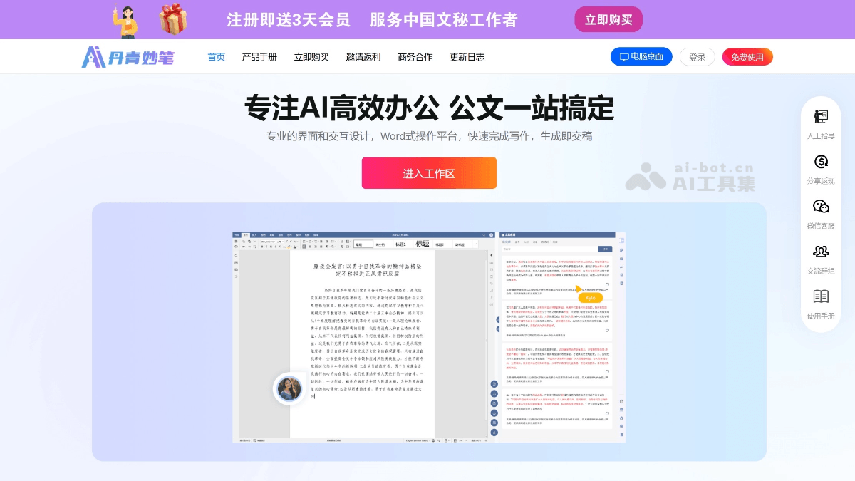 - 进入工作区:访问丹青妙笔官网 https://www.danqingmiaobi.com/ ,点击”进入工作区”按钮,进入类似Word的在线编辑界面。