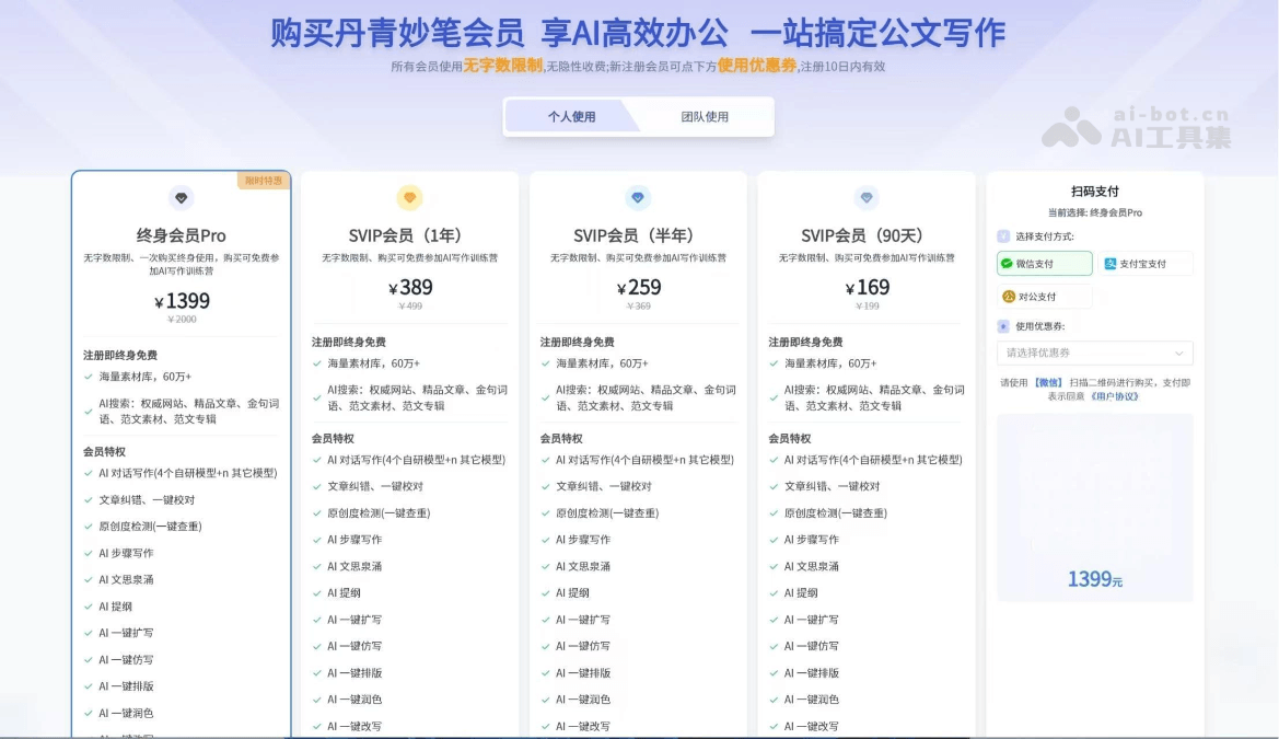 - 终身会员:免费参加 丹青妙笔 所有的及后续的AI公文写作训练营。其他会员 无此权益