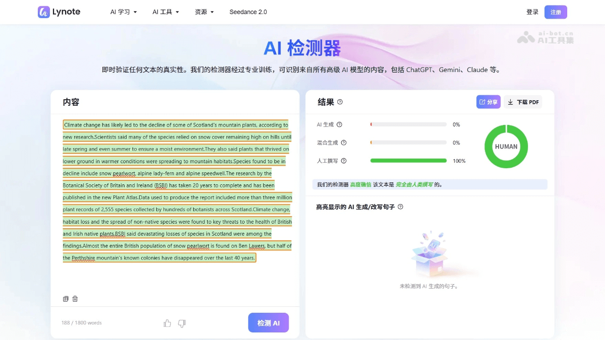 - 查看结果:Lynote会显示文本的 AI 生成概率,用不同颜色标注疑似 AI 撰写的句子。