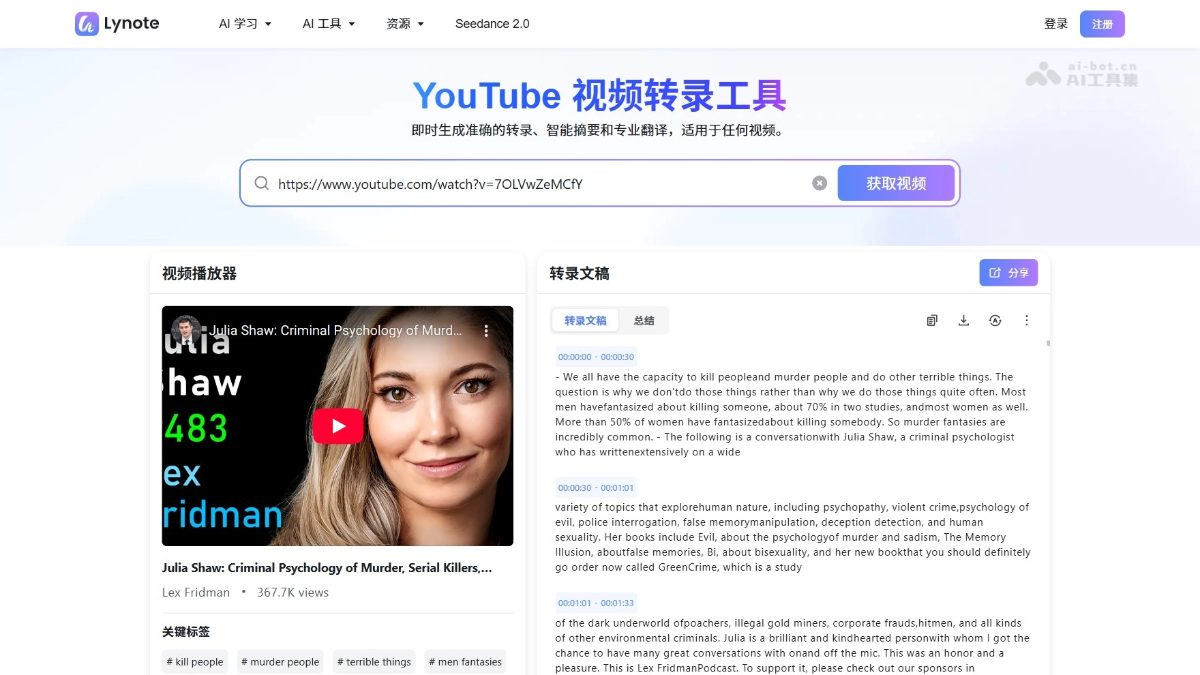 - YouTube 视频转录工具:即时生成准确字幕、智能摘要与专业翻译,支持一键处理任意视频内容。