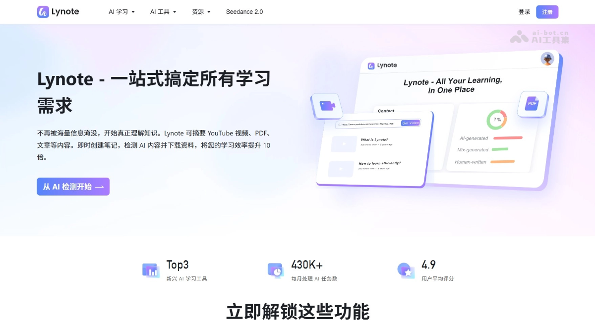 Lynote 是面向学生、研究者和职场人士的 AI 学习助手,专注于解决信息过载问题。Lynote 能快速摘要 YouTube 视频、PDF 和文章,精准检测 AI 生成内容,支持一键下载视频供离线学习,将机械化的 AI 文本转化为自然流畅的表达。Lynote 能帮用户把数小时的阅读和观看压缩成几分钟的核心要点,让学习效率高效提升。