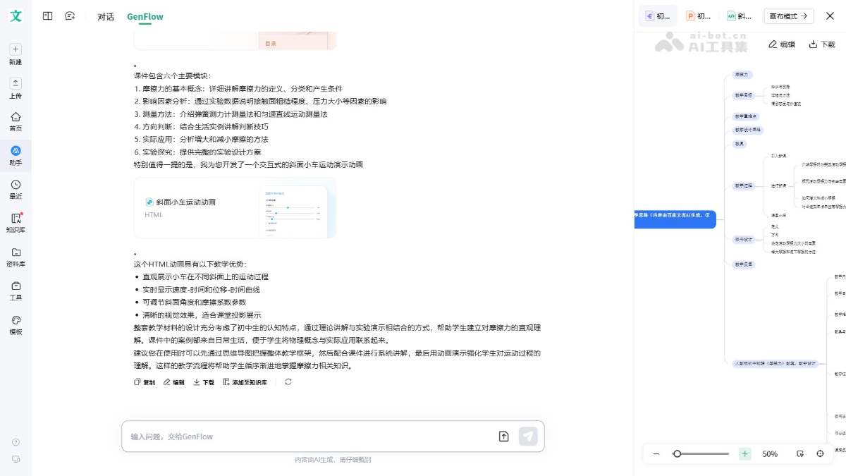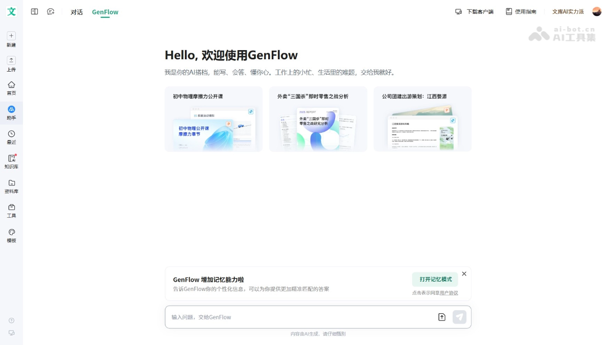 - 登录平台:访问百度文库官网 https://wenku.baidu.com/,找到GenFlow入口,进入主界面开始使用。APP端访问 百度文库 APP 的首页底部或“智能助手”页面,切换选择 GenFlow 。
