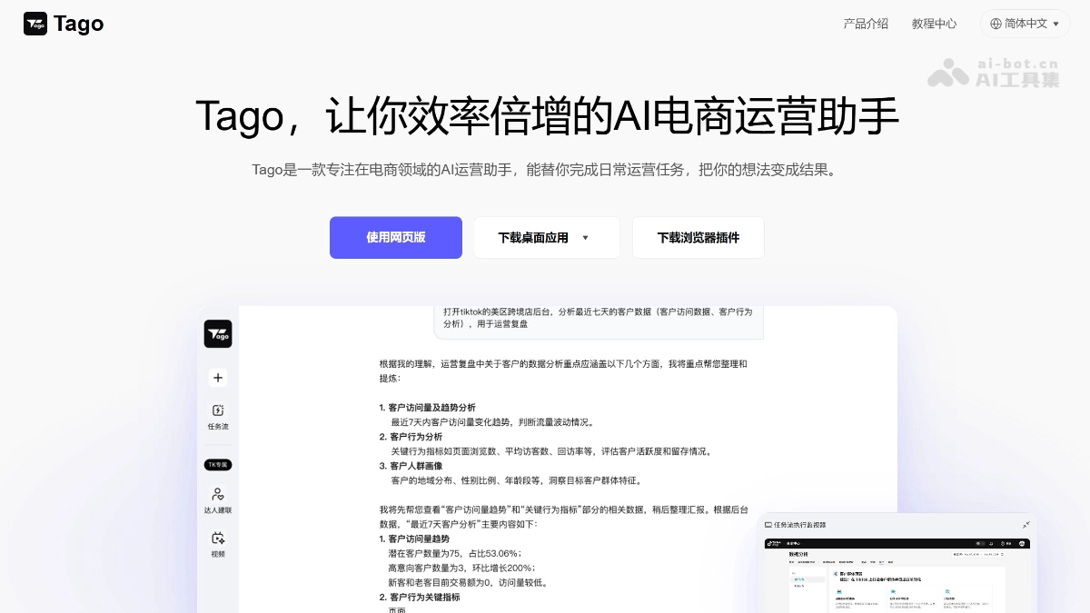 Tago 是专注于电商领域的 AI 运营助手,基于多智能体架构设计,能高效完成多种电商运营任务。主要功能包括电商视频生成、网页自动化操作、视频分析、达人管理、电商图片处理以及数据分析和调研等。通过多智能体技术,Tago 可以实现从想法到结果的自动化流程,帮助电商运营人员节省时间,提升效率。