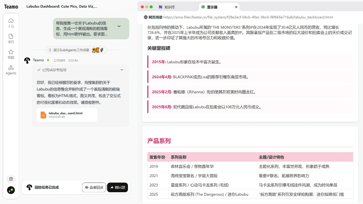官方示例一:帮我搜集一些关于Labubu的信息,生成一个美观清晰的前端看板,用html附件输出。要求图文并茂,贴一些Labubu的可爱图片;数据清晰详实,可视化图表呈现,有动效、有交互。