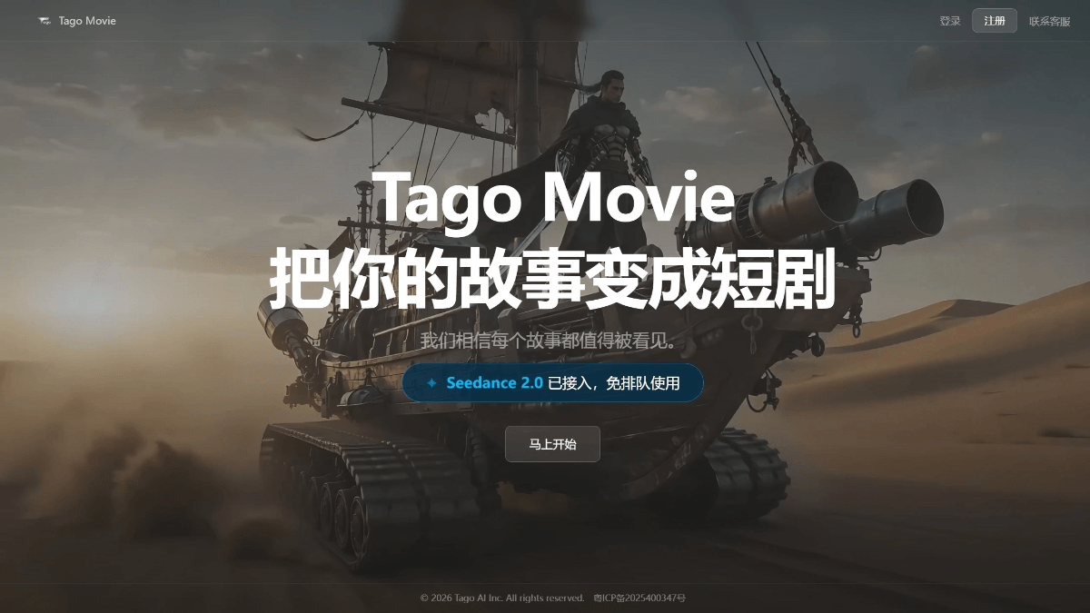 TagoMovie 是专为零基础新手打造的一站式 AI 漫剧与短剧创作平台。无需掌握复杂提示词或导演经验,只需输入小说文本或故事创意,通过”6步走”傻瓜式工作流,快速生成可直接发布于抖音、B站、快手等平台的”出街级”精美漫剧与短剧。TagoMovie 支持单次高达 3 万字的文本输入,AI 自动拆解剧情、提炼对话并生成专业剧本;独有的”本剧资产库”确保角色形象在多镜头中保持一致,内置顶级渲染模型实现自动打光与运镜。真正实现”扔个故事进去,大片自动出来”的创作体验。