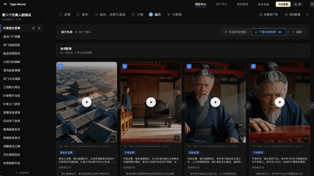 全流程自动化:从剧本→分镜→成片→剪辑,一站式完成传统影视团队工作。