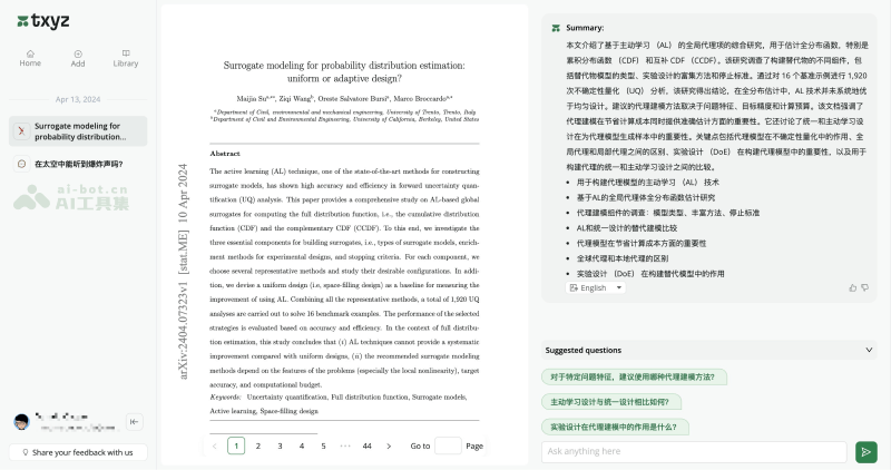 - 跨学科研究:对于从事跨学科研究的人员,txyz.ai能够提供跨领域的文献搜索和推荐,帮助他们发现不同领域之间的联系和潜在的研究机会。