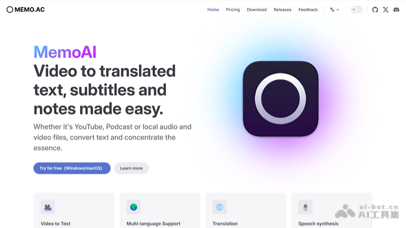 MemoAI是免费的AI语音转文字工具,支持YouTube、播客及本地音视频文件转文本。MemoAI具备多语言转录、翻译、语音合成、说话人分离、实时字幕等功能。支持NVIDIA和AMD GPU加速,快速处理媒体文件。提供浮动笔记、剪辑分割、AI摘要和多种导出选项。MemoAI注重隐私,完全离线工作,跨平台支持Windows和macOS。