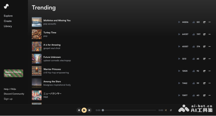 Suno是一个专业高质量的AI歌曲和音乐创作平台,用户只需输入简单的文本提示词,即可根据流派风格和歌词生成带有人声的歌曲。该AI音乐生成器由来自Meta、TikTok、Kensho等知名科技公司的团队成员开发,目标是不需要任何乐器工具,让所有人都可以创造美妙的音乐。Suno还与微软合作,支持直接通过微软的Copilot调用其插件生成音乐。Suno最新已将音乐生成模型升级到V3版本,可生成2分钟的歌曲。