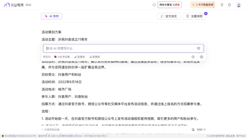 火山写作是由字节跳动旗下的火山引擎团队推出的AI中英文写作助手,只需简单输入指令,即可快速生成原创文章,助力内容创作者更加流畅和自信地写作文章。无论你是创作者、自媒体、白领、还是学生,火山写作都能帮助你高效地写出专业、高质量的文章。