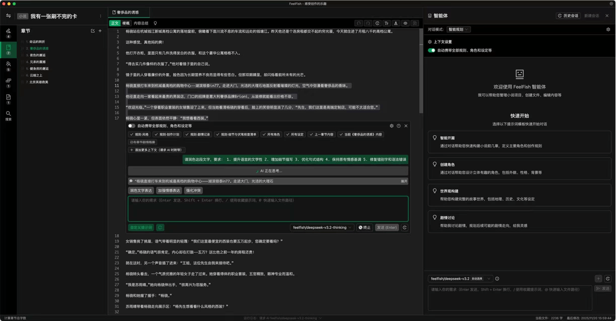 FeelFish 是专为小说创作者设计的 AI 写作工具,通过智能辅助提升创作效率和质量。支持剧本和非虚构类书籍创作,擅长长篇内容的创作。面向专业作家设计,基于 FeelFish 智能体提供优秀的人机交互页面,让 AI 和作家可以深度地协作共创优质小说等专业内容。具备强大的角色和设定规划功能,可让用户详细输入角色性格、外貌、背景以及世界观规则,AI 会严格遵循这些设定进行创作,避免人设崩塌或逻辑矛盾。FeelFish 的上下文管理功能可自动总结前文内容,确保新生成的章节自然衔接,保持风格和剧情连贯性。支持多种主流大模型,如 DeepSeek、ChatGPT、Gemini 等,用户可根据需求选择合适的模型,通过自定义提示词精准控制创作方向。