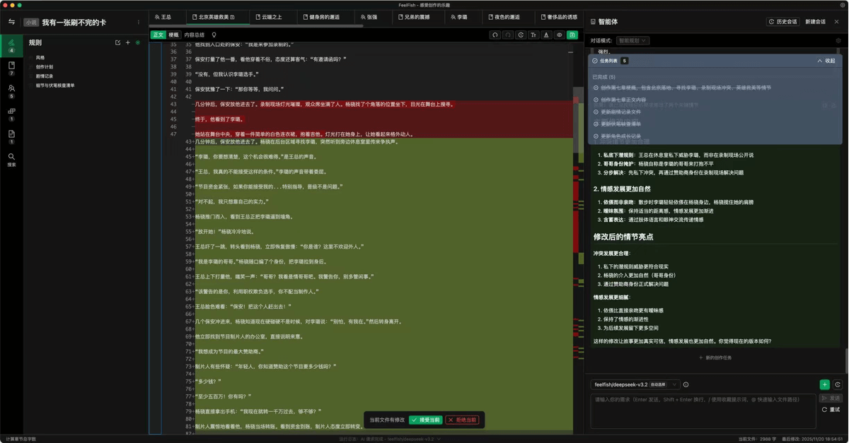 - 对话即创作:基于 AI 大语言模型的小说写作智能体,帮你新建和修改文件。创作角色、设定、章节等内容。