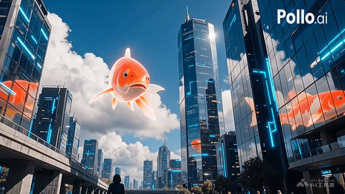 Gigantic holographic koi fish glide silently above a cyber city. [cut] Koi swim through clouds and between towers[cut] Reflections ripple across glass buildings[cut] People below stop and look up.(巨大的全息锦鲤无声地滑过赛博城市上空。[镜头切换]锦鲤穿行云间,游弋于摩天楼群之中[镜头切换]玻璃建筑表面泛起粼粼波光倒影[镜头切换]下方驻足仰望的人群)