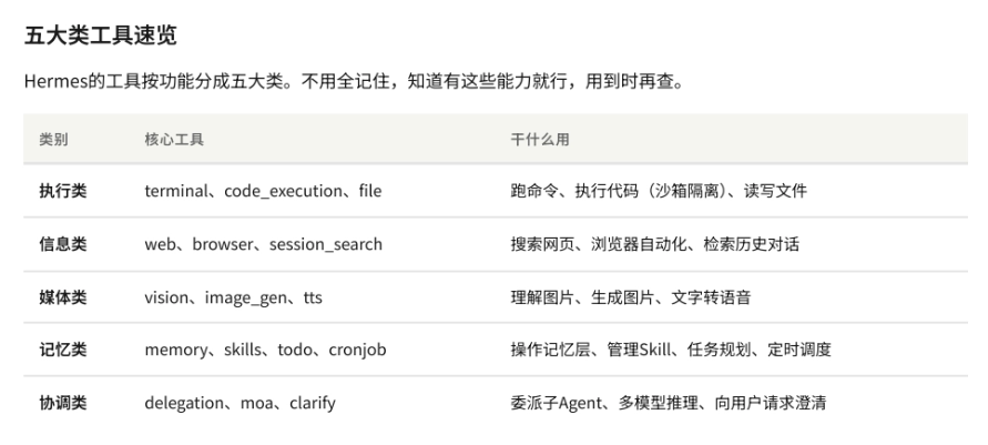 五大类工具:执行(terminal/code_execution)、信息(web/browser)、媒体(vision/image_gen)、记忆(memory/skills)、协调(delegation/moa/cronjob)