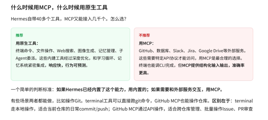 - 关于工具定位,手册提出”三匹马”理论:Claude Code 是实时编码的”工匠”,Hermes 是后台值守的”管家”,OpenClaw 是定义行为的”规范”。三者非替代关系,是通过 agentskills.io 标准实现 Skill 互通,用户应根据任务特性(需实时协作、放后台运行、需审计合规)进行组合使用。