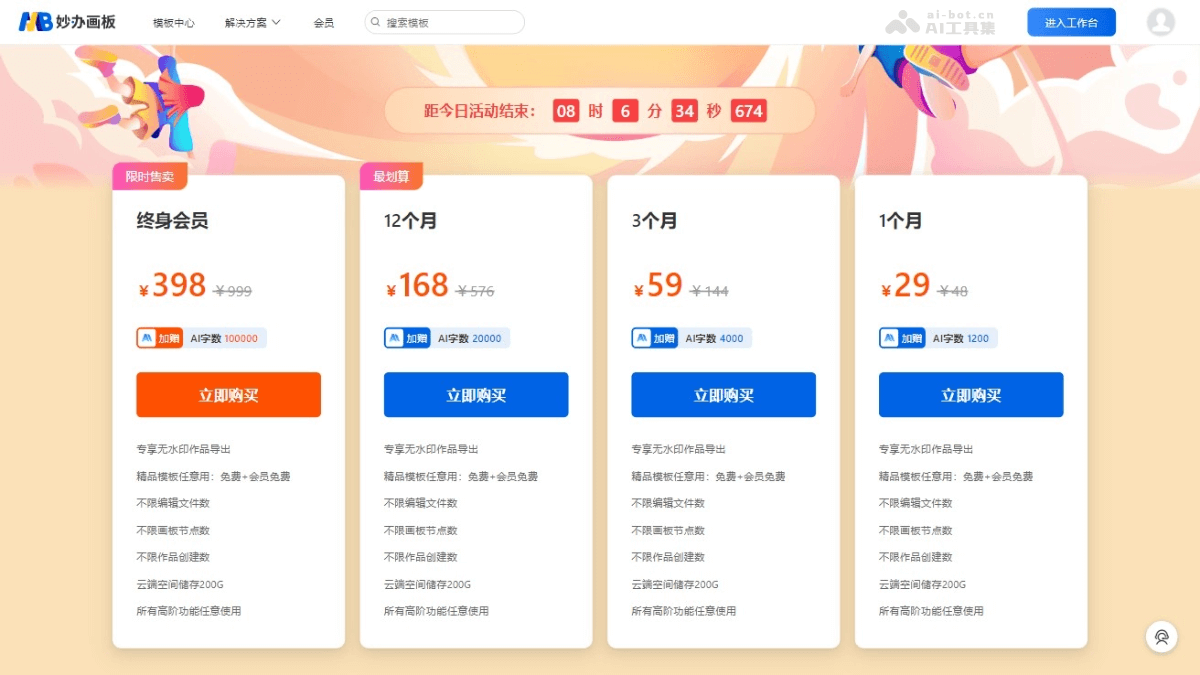- 终身会员:¥398(原价¥999),额外赠送:AI字数100000。