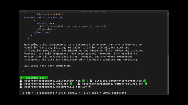 - 任务分解与执行:Plandex能够将复杂的开发任务项目分解成更小的子任务(如任务规划、代码补全、代码编写、代码审查等),并逐一完成它们,直至整个任务顺利结束。