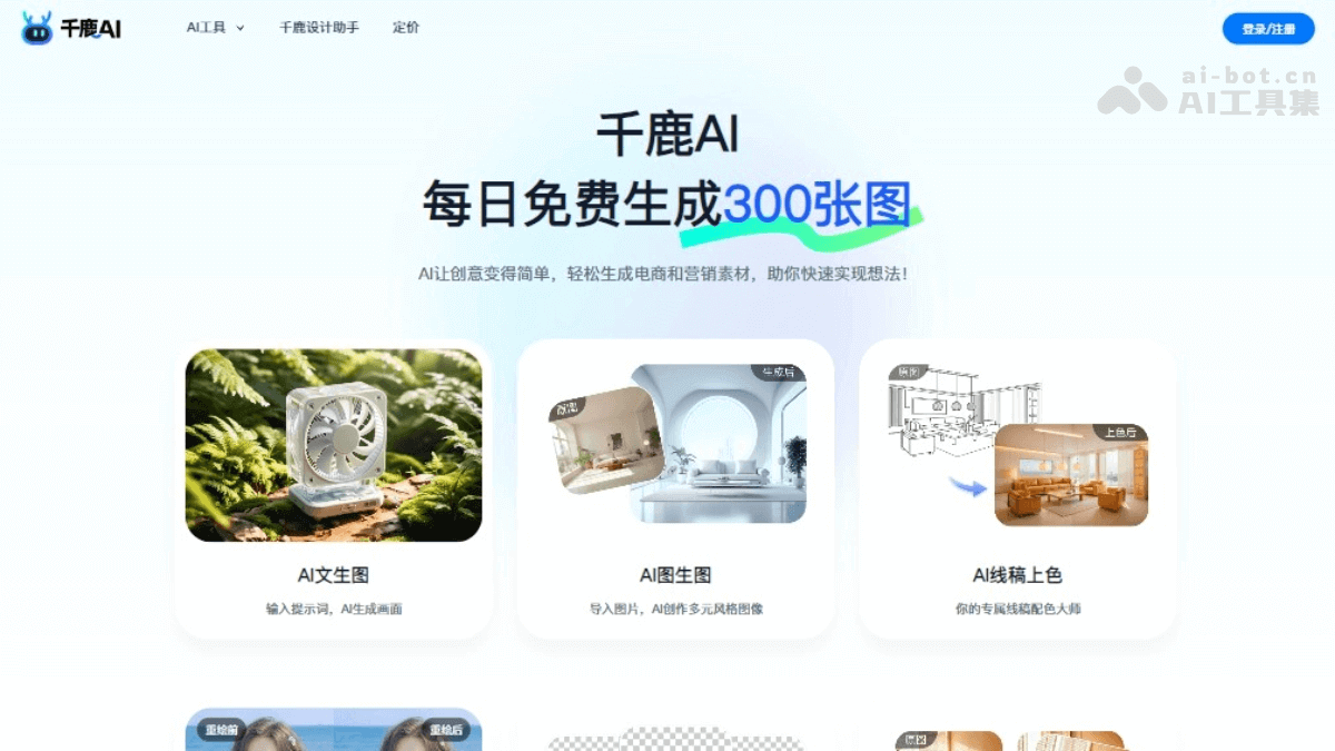 千鹿AI是一个AI设计助手,提供AI文生图/图生图、AI扩图、AI线稿上色、AI抠图等功能,大幅提高设计师和内容创作者的工作效率。用户每日可免费生成300张图像,适合电商、广告和社交媒体等场景。平台界面简洁,操作便捷,支持多种操作系统和设计软件。
