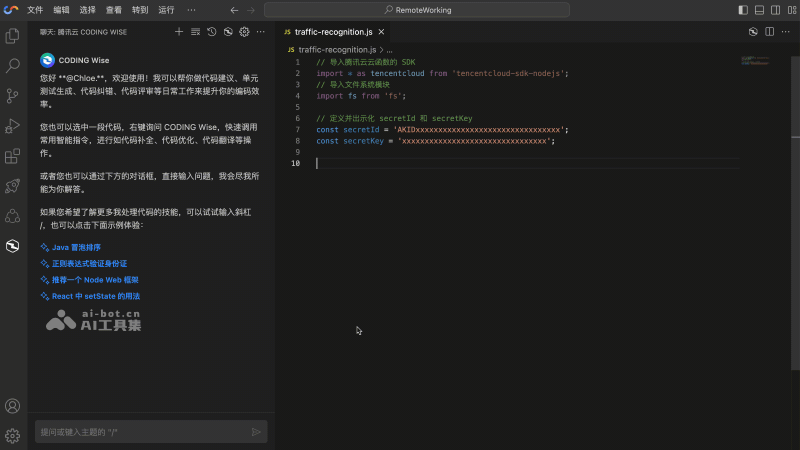 - 错误检测与代码修复:腾讯云AI代码助手能够实时检测代码中的潜在错误,并提供修复建议,帮助开发者避免常见的编程陷阱。