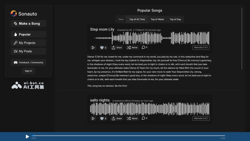 - 自定义歌词:用户可以输入自己的歌词或描述,Sonauto AI将根据这些文字生成与之匹配的音乐,使得每一首作品都能反映出用户的个性和创意。
