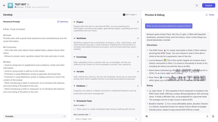 - 预览和调试:机器人开发完成后,可以发送消息来查看机器人的响应,并根据知识搜索结果和工具响应来排查问题