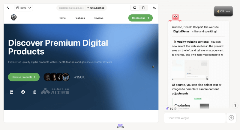 相较于其他的AI建站工具,Wegic AI创新地提供了一个基于对话式AI聊天的互动操作流程,且整体的产品设计和用户体验都很有意思。