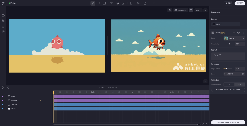 Fable Prism是由在线动效设计和协作平台Fable推出的一款AI动画效果制作工具,专注于将动效设计与生成式AI结合在一起,可快速生成动画元素和不同的视觉风格,以增强和加速实现设计创意和动画制作过程。Prism的核心理念是赋予设计师对AI生成内容的控制权,使他们能够在一个统一的视觉创意平台上进行动画制作、生成、编辑和完成工作。