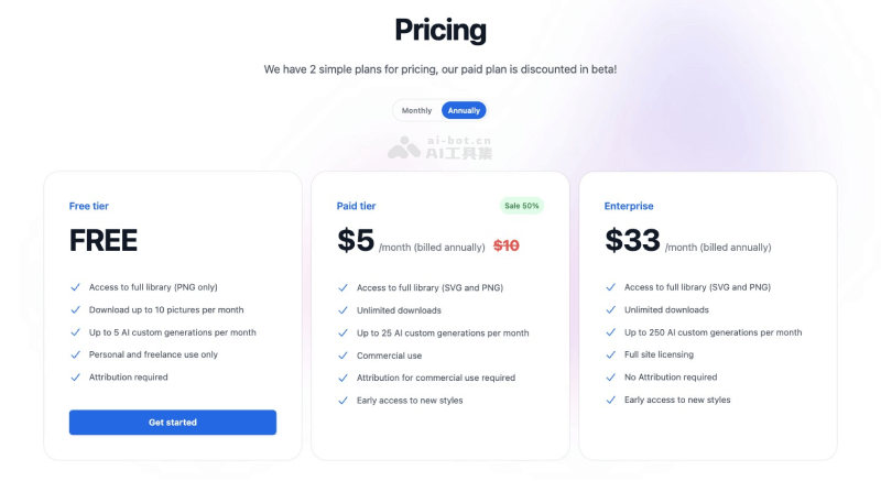 - 付费版:7.5美元每月(年付折合5美元每月),可以访问所有的PNG和SVG插图库、不限次数下载、每月25次AI生成、商业用途但需注明归属