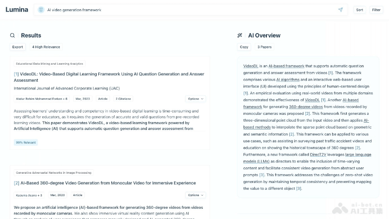 - AI概述功能:提供基于搜索结果的AI生成论文概述,Lumina帮助用户快速把握论文核心内容。