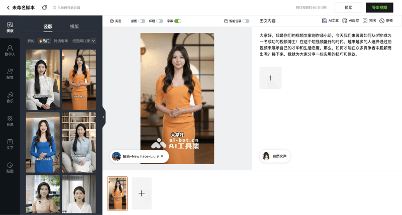 - 口播视频智能成片: 结合AI写作和智能包装,用户可以快速生成数字人口播视频。这个功能支持一键智能剪辑,批量生成短视频,帮助用户高效地打造内容矩阵。