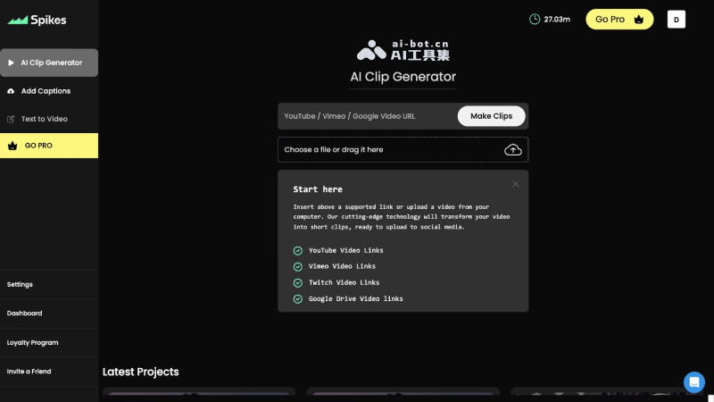 - 粘贴长视频的URL或者上传本地视频,Spikes会自动识别视频长度