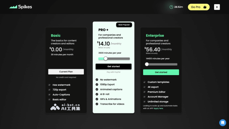 - Pro专业版:年付的话每月14.10美元起,每月可上传300分钟的视频,提供1080P视频导出、无水印、AI B-Roll、GIF和动画、视频转录、90天云存储等权益