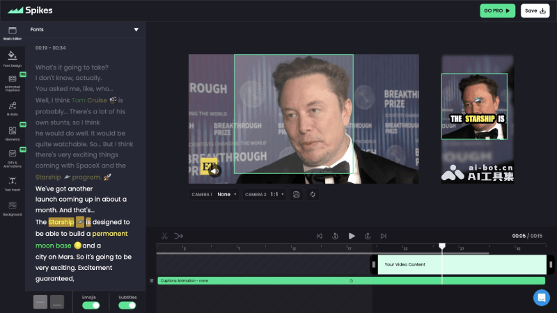 - 多角色动态字幕:Spikes支持为视频添加动态字幕,使得对话或访谈类视频更加生动,同时提供多角色字幕功能,增强视频的表现力。