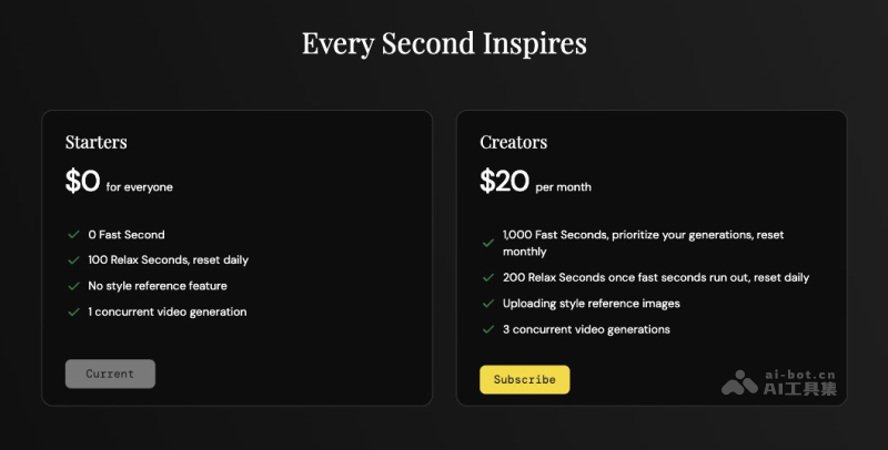 - Creator创作者版:每月20美元,提供每月1000秒的优先快速音乐视频生成,快速生成额度用完后每日还提供200秒普通速度的视频生成,支持上传风格参考图片、同时进行3个视频生成队列
