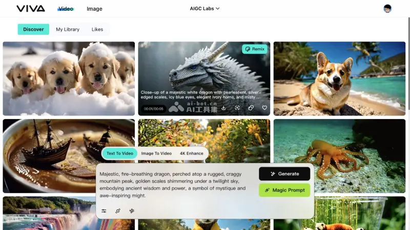 - AI视频生成:Viva AI突破了传统视频制作的界限,能够根据文本描述(文生视频)或现有图像(图生视频)生成引人入胜的视频内容,为视频创作者提供了无限的可能性。